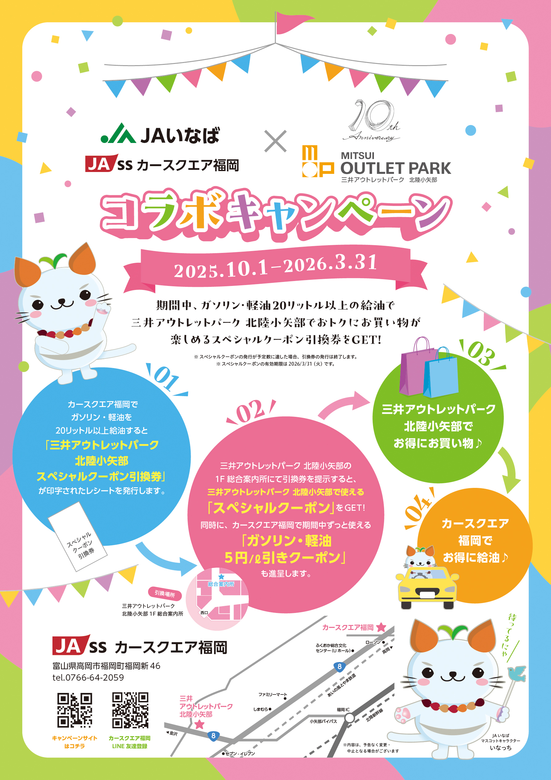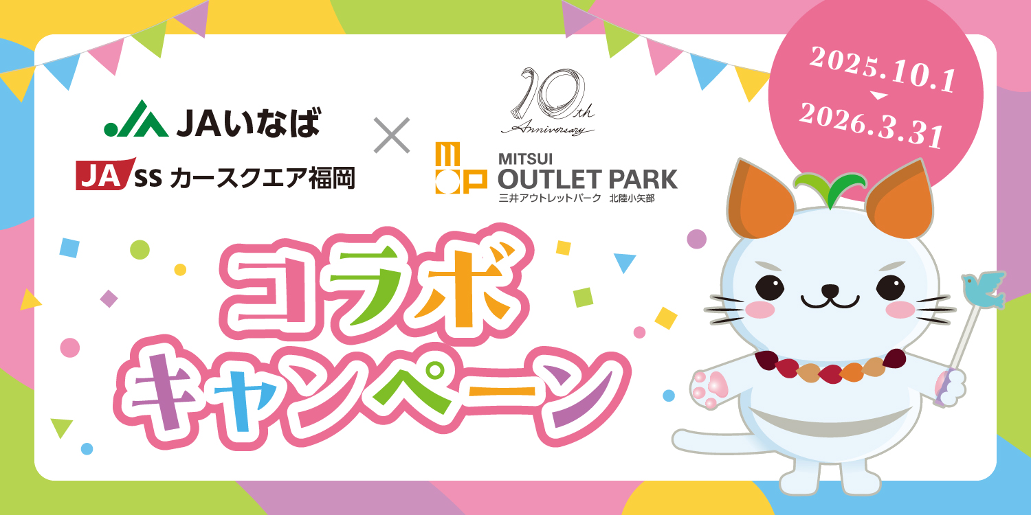 「カースクエア福岡」と「三井アウトレットパーク 北陸小矢部」のコラボキャンペーンを開催中します。期間中、ガソリン・軽油を 20リットル以上給油すると、三井アウトレットパーク 北陸小矢部でオトクにお買い物が楽しめる「スペシャルクーポン引換券」を進呈します。
